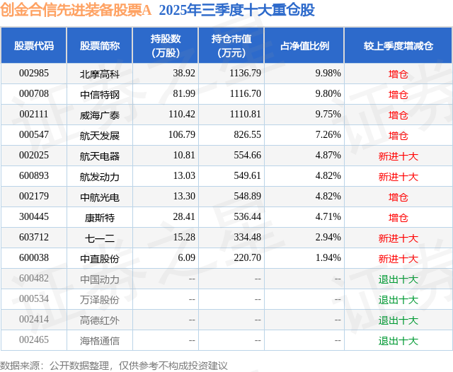 根据2025基金Q3季报公募基金重仓股数据,重仓该股的公募基金共1家,其中持有数量最多的公募基金为创金合信基金的创金合信先进装备股票A。创金合信先进装备股票A目前规模为0.38亿元,最新净值1.7297(1月13日),较上一交易日下跌2.62%,近一年上涨62.43%。该公募基金现任基金经理为李晗。