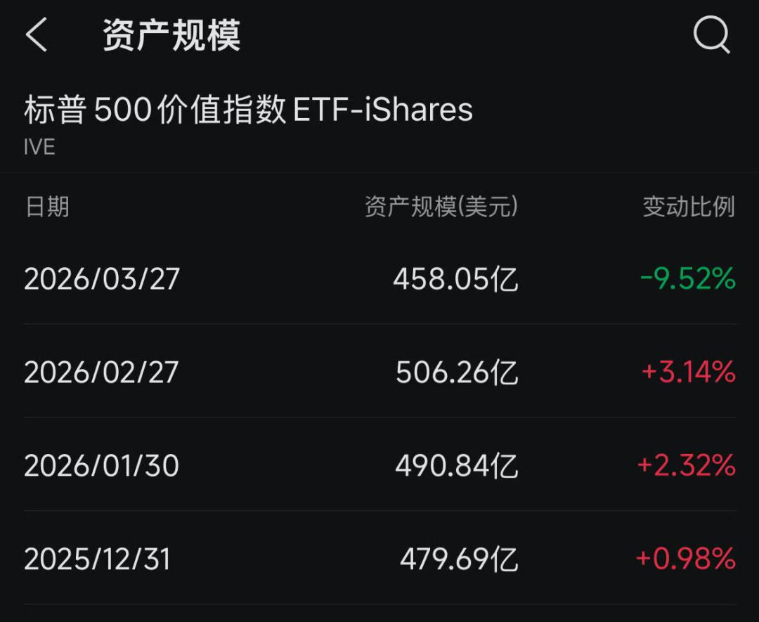 与此同时,部分美股ETF遭遇资金显著净流出。截至3月27日,标普500价值指数ETF-iShares规模为458.05亿美元,相较于2月底的506.26亿美元降低9.52%。
