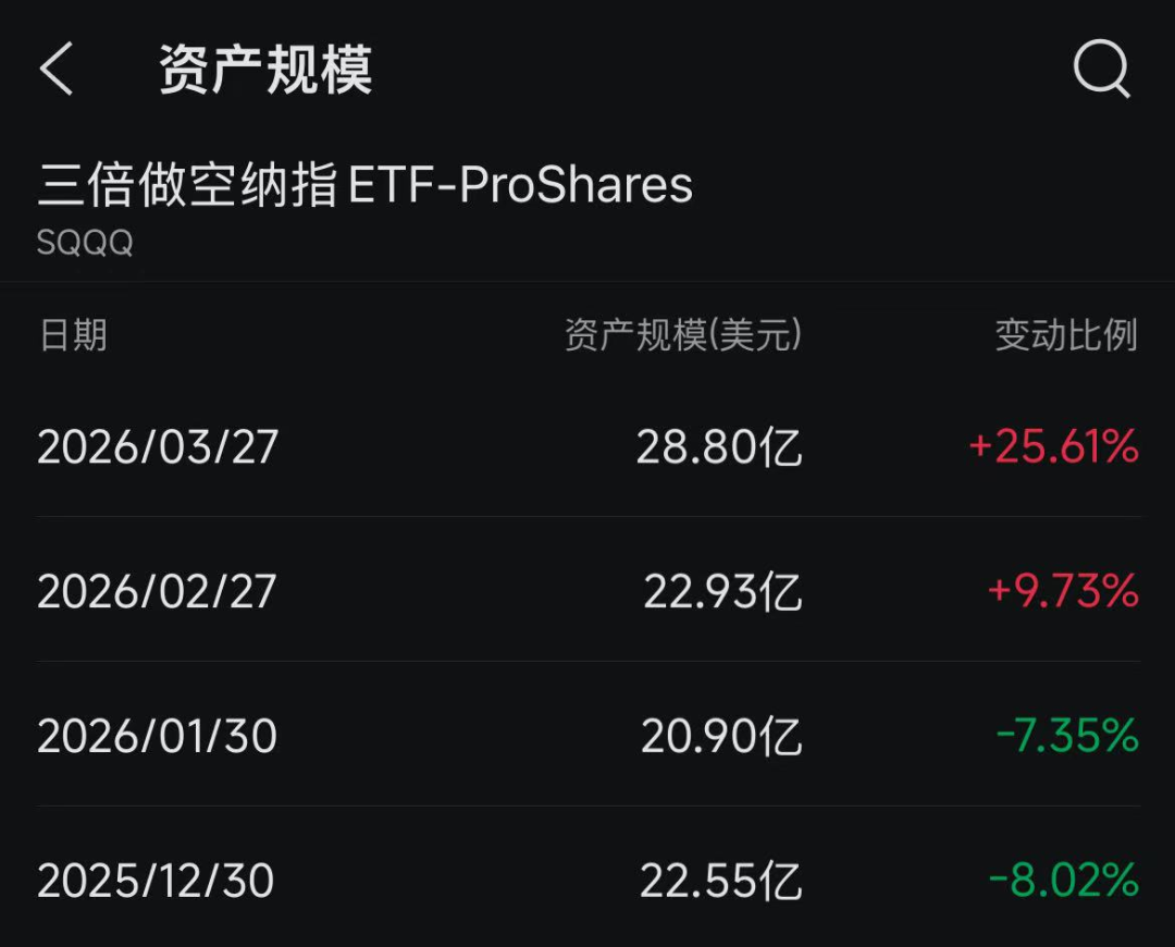 具体来看,截至3月27日,三倍做空纳指ETF-Proshares规模为28.8亿美元,相较于2月底的22.93亿美元猛增25.61%。