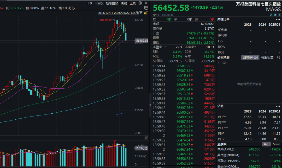 3月以来,在中东局势扰动下,美股持续走弱。截至3月27日,纳斯达克指数、道琼斯工业平均指数和标普500指数分别下跌7.6%、7.78%、7.41%。值得注意的是,上述三大指数的周线均已连续五周收跌。此外,万得美国科技七巨头指数3月以来跌幅达到8.78%。