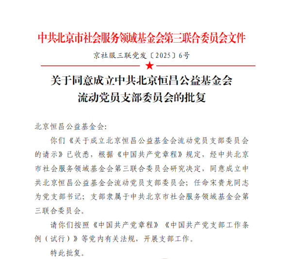 红色是信仰的底色,也是恒昌公益高质量发展的精神引擎。2025年11月25日,恒昌公益党建工作迎来历史性跨越:在北京市社会服务领域基金会第三联合委员会的悉心指导与鼎力支持下,北京恒昌公益基金会流动党员支部委员会正式获批成立。这一里程碑式突破,不仅为公益注入了全新的元素,更标志着恒昌公益正式迈入“党建引领、行稳致远”的崭新篇章。