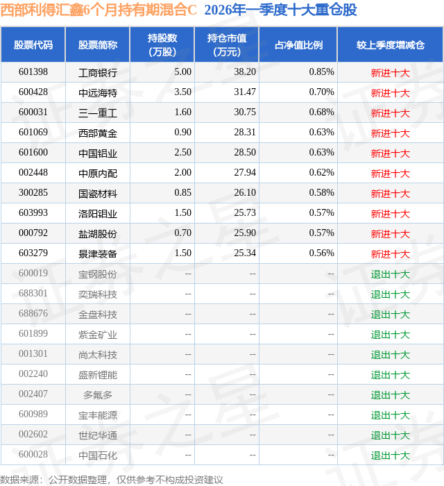 从基金规模来看,西部利得汇鑫6个月持有期混合C基金2026年一季度公布的基金规模为0.36亿元,较上一期规模3452.25万元变化了116.46万元,环比变化了3.37%。该基金最新一期资产配置为:股票占净值比12.96%,债券占净值比52.09%,现金占净值比11.0%。从基金持仓来看,该基金当季前十大股票仓位达6.39%,第一大重仓股为工商银行(601398),持仓占比为0.85%。