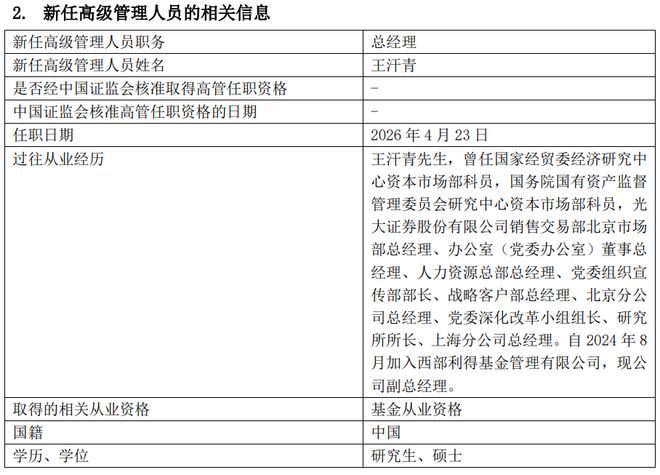 2026-04-24百家乐,百家乐官方网站,百家乐APP下载,百家乐游戏平台4月23日,西部利得基金发布高管变更公告称,副总经理王汗青因工作安排,即日起转任公司总经理。董事长何方不再代任公司总经理职务。